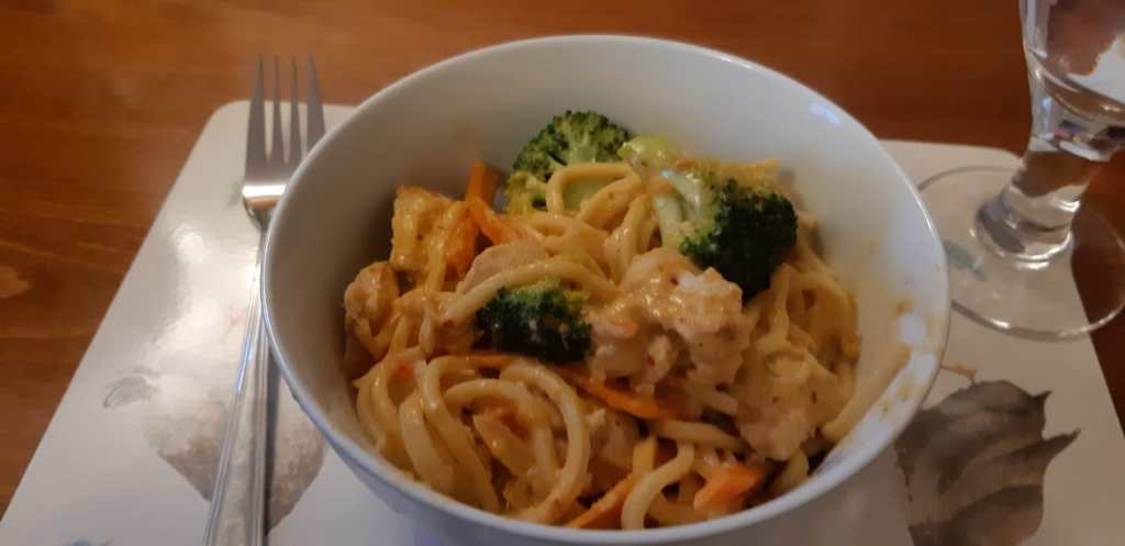 I first came across this recipe when my friend Bruce cooked it for us on our Lake District vacation. It is a very unique recipe as the coconut sauce elevates the flavours and to be honest, the ginger, garlic and Thai Red Curry paste in a coconut base are pure music. In Bruce’s own words he likes to ‘hear the garlic, ginger and others spices in oil to release the flavours’. The first picture here is from when Bruce cooked it, with chicken, broccoli and carrots. The next pic is today when I tried to replicate it with peppers and carrots :-). Thank you Bruce for the detailed explanation and tips π