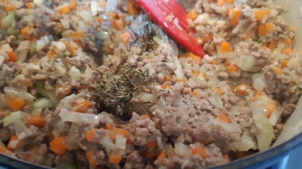 Add the rosemary, thyme, sherry, salt and pepper and mix well.