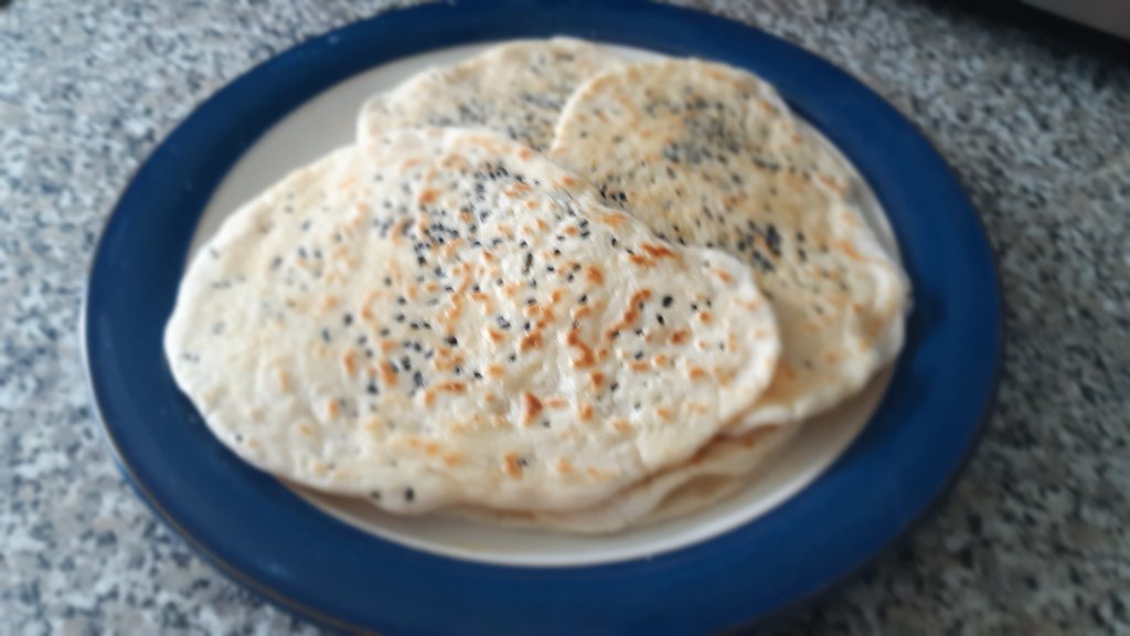 Top with nigella seeds and continue to roll till the seeds stick to the naan and the naan is a few mm thick.