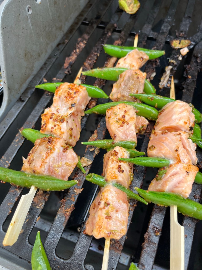 Arrange the salmon and sugar snap peas on skewers.