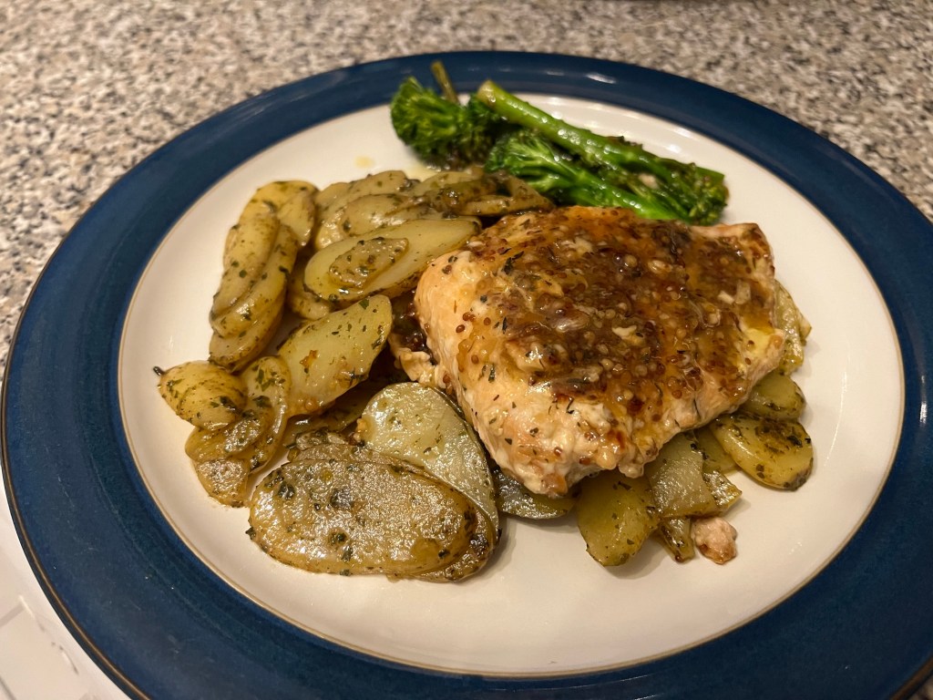 Serve the salmon on a bed of honey glazed potatoes and tender-stem broccoli. The marinade we poured when cooking the fish will have thickened in the pan, pour it over the salmon after plating and enjoy.
