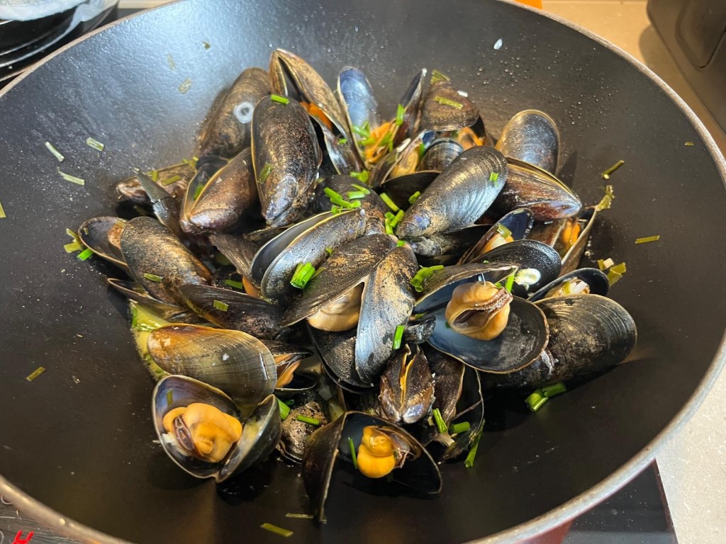 Turn off the heat. All the mussels should be open — that’s how you know they’re cooked. Any that remain closed should be discarded without ceremony.